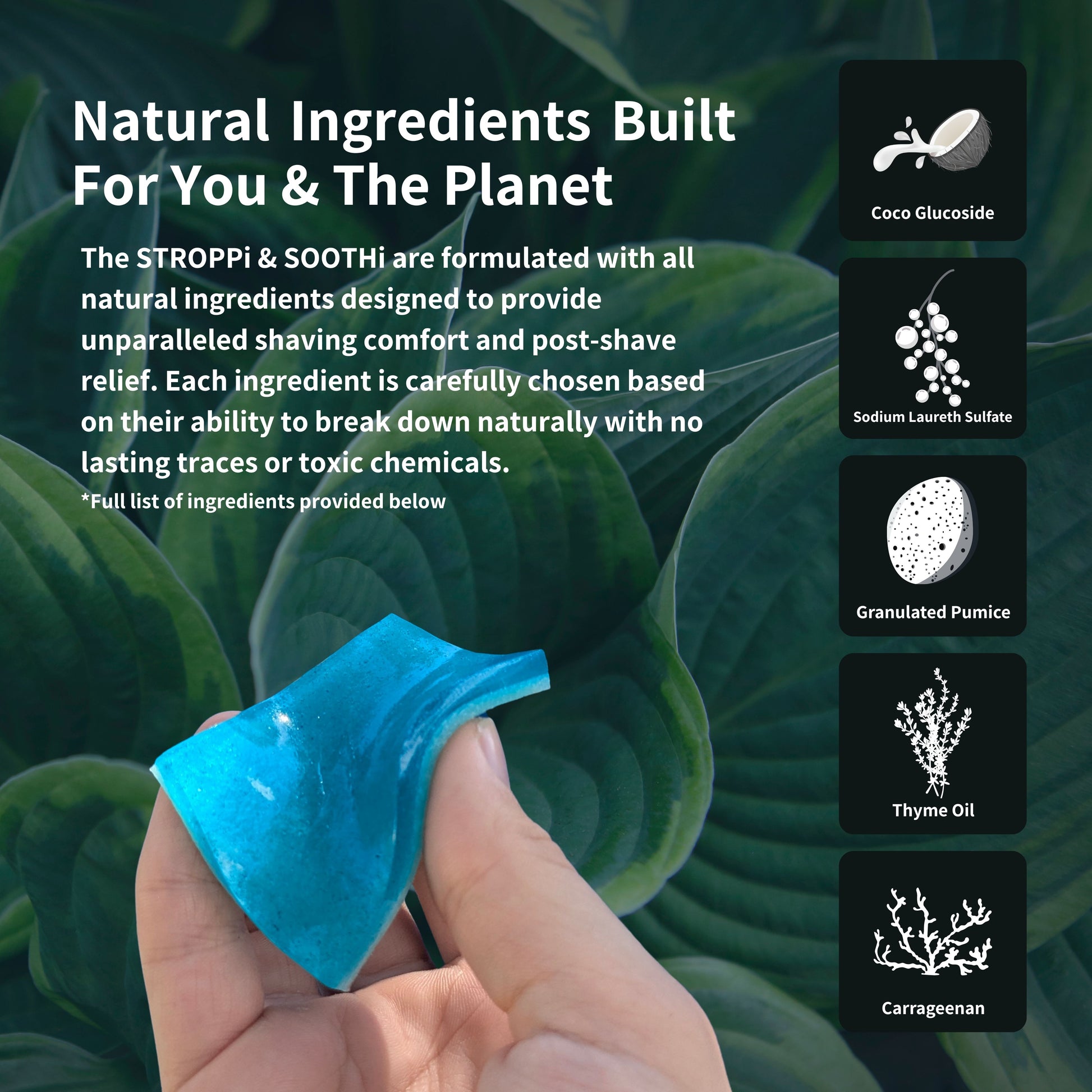 …that's why every ingredient in both the STROPPi and the SOOTHi are clean, effective, and there for a reason—no fillers, no harsh chemicals, no shortcuts. Each is purpose-driven, chosen for performance, skin health, and to biodegrade safely, leaving no trace or harmful chemicals behind.